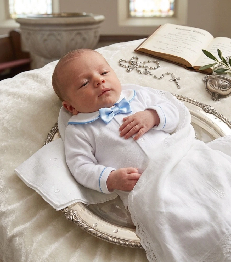 Elegantné body na krst s motýlikom so zapínaním v predu a medzi nohami na patentiky. Motýlik sa dá neskôr veľmi jednoducho odpárať. celý popis