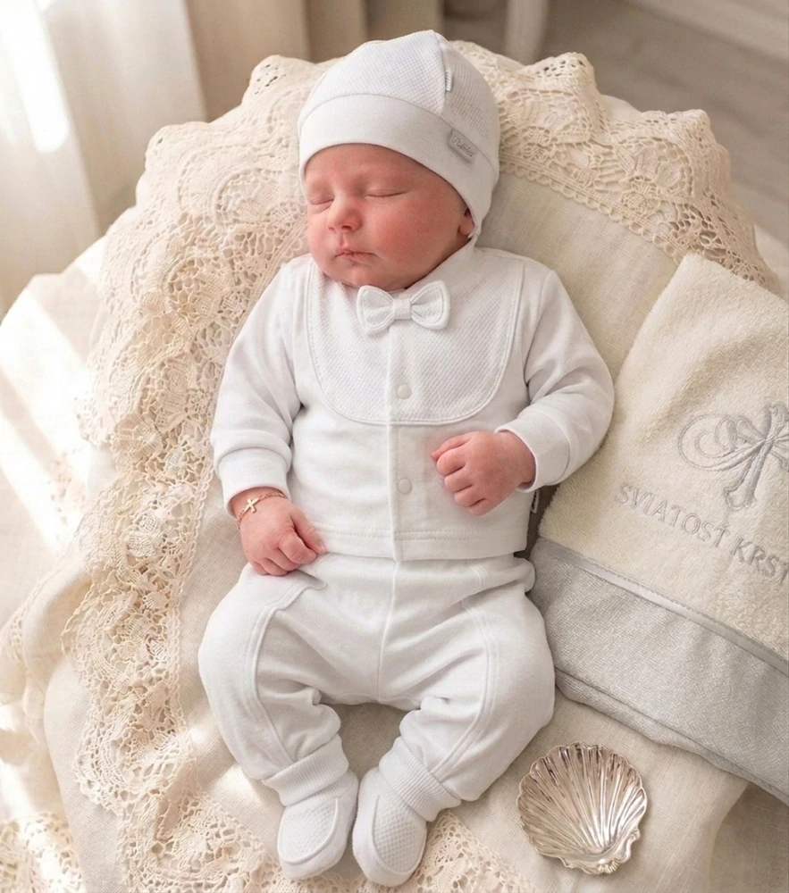 Bavlnená chlapčenská súprava na krst s jemným námorníckym motívom. Kabátik na zapínanie vpredu doplnený motýlikom. Nohavice, papučky a čiapočka na zaväzovanie.