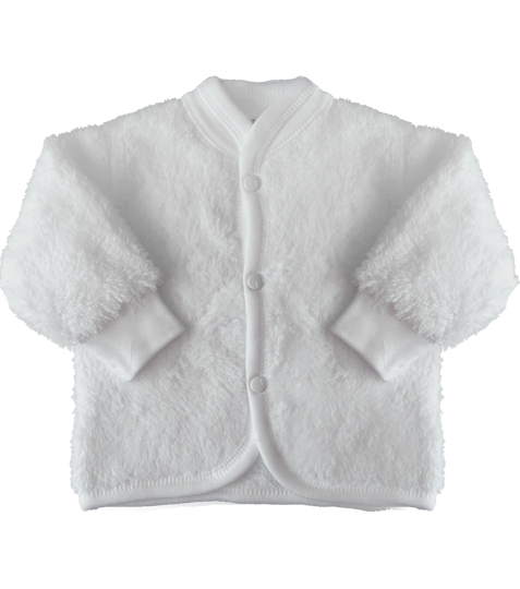 Teplý biely svetrík na krst so stojačikom. Rukávky sú ukončené do pružného patentu. Zapínanie ma na cvoky po celej dĺžke v prednej časti. Ideálna vrchná časť odevu v chladnejších priestoroch pri krste.