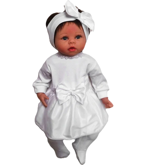Dievčenská bavlnená súprava na krst. Vrchný diel a čelenka zdobená výraznou saténovou mašľou. Áčkový saténovo-tylový strih kopíruje tvar šiat. Golierik pod krkom zdobený saténovou madeirou. Zapínanie na zips vzadu. Súčasťou sú praktické biele polodupačky so širokým pružným pásom.