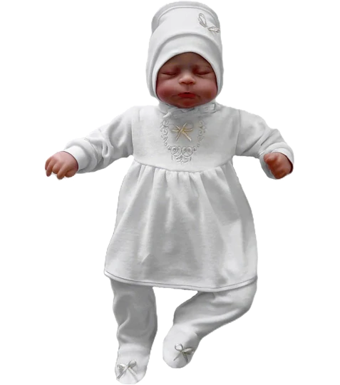Dievčenská zamatová súprava na krst. Vrchný diel zdobí výšivka a zlatá mašlička. Zapínanie vzadu. Polodupačky v spodnej časti zdobené rovnakou zlatou mašličkou. Čiapočka na zaväzovanie šnúrkami zdobená opäž zlatou mašličkou.