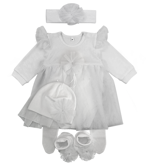 Súpravu na krst tvoria šatové body, pančušky, čelenka, čiapka a papučky. Tylové doplnky dodávajú súpravičke elegantný vzhľad. Šaty majú zapínanie na ramenách po oboch stranách na patentné gombíky. Na rukávoch majú všité volániky a všitú sukničku s ozdobným kvietkom. Rukávy sú ukončené do pružných manžetiek. Všité body, pančušky a papučky sú bavlnené s našitými tylovými kvetinami na papučkách. Čiapka a čelenka je vyrobená zo zmesového pružného materiálu (96% bavlna, 4% elastan) a sú zdobené kvetinami.
