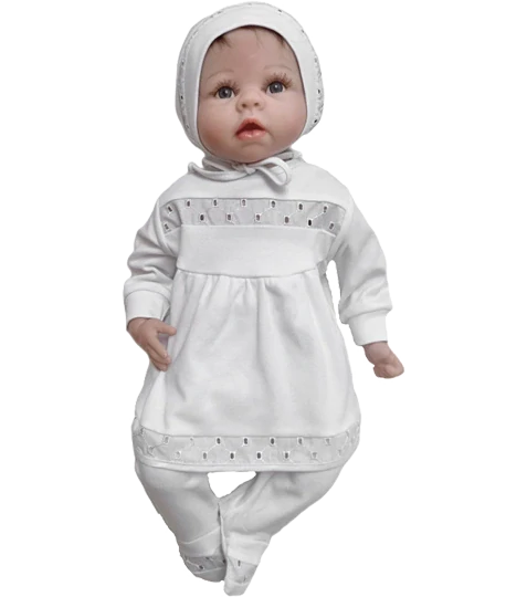 Bavlnená dievčenská súprava na krst. Moderný krajkový vzor so saténovým lemovaním po okraji. Vrchný diel so zadným prekladaným zapínaním. Polodupačky dole zdobené a čiapočka na zaväzovanie.