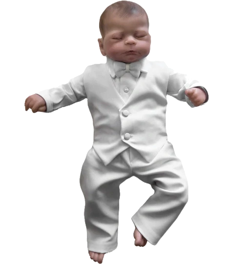 Chlapčenský oblek na krst. Bavlnené košeľové body s dlhým rukávom a golierikom so zapínaním na gombíky po celej dĺžke vpredu. Vrchný diel tvorí vestička z gabardénu a samostatný motýlik. Spodný diel sú nohavičky rovnako z gabardénu.