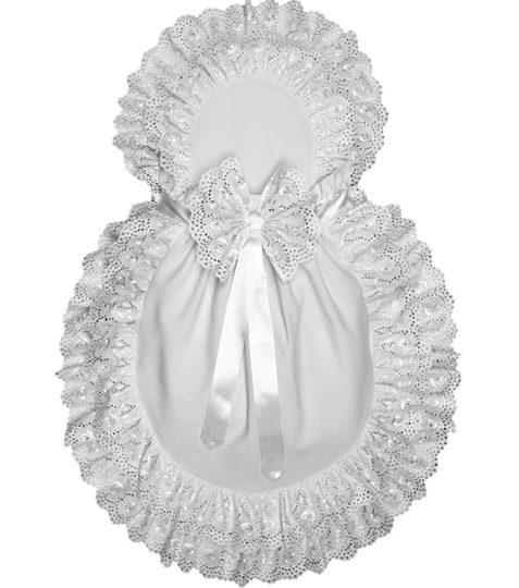 Luxusná obdĺžniková perinka na krst v rozmere 112×35 cm. Zdobenie dvoma ozdobnými madeirovými volánmi v oblasti hlavičky dieťatka a našitou madeirou vo vrchnej časti viazania zavinovačky. Uväzovanie pomocou 3 párov saténových stúh. Vyberateľná výplň. Krásny naberaný prehoz, ktorý sa pripevní na zavinovačku pomocou šnúrok na zaväzovanie. Zdobený je dvoma ozdobnými madeirovými volánmi a mašľou. Balenie v ozdobnej krabici.