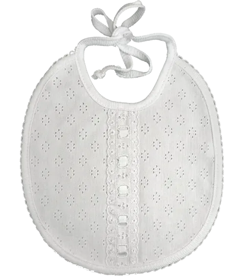 Bavlnený sviatočný podbradník na krst. V strede zdobený saténovou stuhou kombinovanou s krajkou a háčkovaním po obvode.