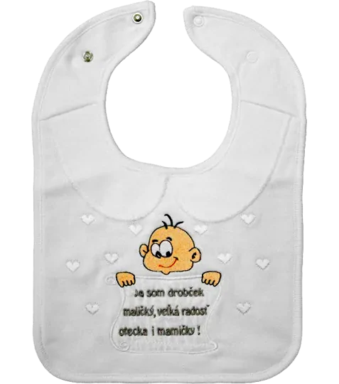 Darčekový bavlnený podbradník s vyšívaným nápisom "Ja som drobček maličký, veľká radosť otecka i mamičky!". Našitý guľatý golierik je zdobený háčkovaním a zapínanie je zabezpečené okolo krku pomocou patentných gombíkov v dvoch pozíciách. celý popis