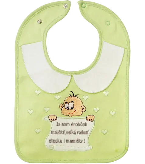 Darčekový bavlnený podbradník s vyšívaným nápisom "Ja som drobček maličký, veľká radosť otecka i mamičky!". Našitý guľatý golierik je zdobený háčkovaním a zapínanie je zabezpečené okolo krku pomocou patentných gombíkov v dvoch pozíciách.