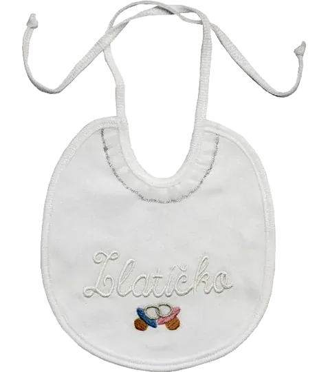 Darčekový bavlnený podbradník na šnúrovanie s vyšívaným nápisom "Zlatíčko" a vyšitými dvoma dekortívnymi cumlíkmi. Po okraji podbradníka v okrúhlom výstrihu organzový volánik so strieborným okrajom.  celý popis